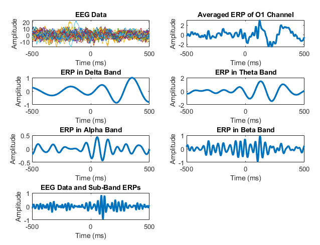 Even if this ERP approach can tell many things about the general processes within the brain, we can get more and more information beyond this fundamental operation by extending this analysis into sub-bands. For this purpose, I divided EEG signals into five sub-bands; delta, theta, alpha, beta, and gamma. Thus, we can obtain the difference of ERPs between these sub-bands. Note that we focused on -500ms and 500ms time intervals around the stimulus.
