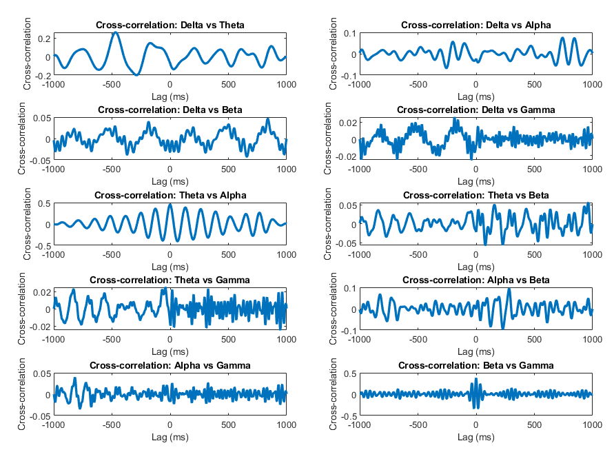 After obtaining sub-band ERPs, we can reveal the additional relationship between these sub-band ERP components. Cross-correlation analysis is a beneficial technique for quantifying the temporal correlation between two series.